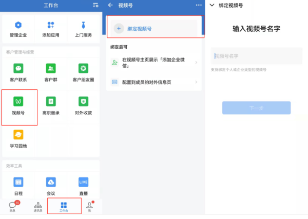 目前企業(yè)微信可以綁定視頻號(hào),綁定后,視頻號(hào)成員對(duì)外信息可以展示出來.具體操作路徑是這樣的,只需管理員登錄企微手機(jī)端,在工作臺(tái)頁面找到“視頻號(hào)”入口進(jìn)入,然后輸入綁定視頻號(hào)名稱,最后通過管理員確認(rèn)即可。