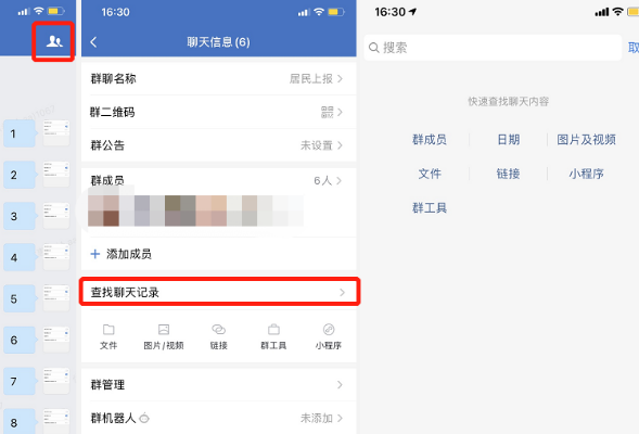 第四種:是通過手機端會話查找歷史聊天記錄,點擊右上角人像按鈕,然后再點擊查找聊天記錄就可以進行搜索。