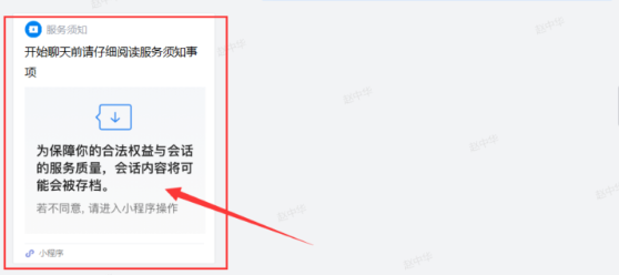 在客戶與企業員工聊天的頁面中,找到聊天最開始接收到的提示,從提示中點擊進入小程序里,點擊“不同意存檔”,企業微信就不會保存企業員工與客戶的聊天記錄了。