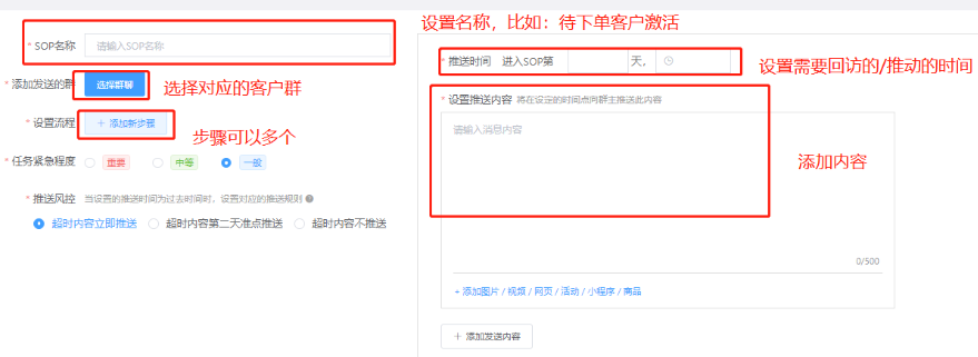 建立一個新的群SOP任務,先要填寫最基本的信息,比如群推送的內容、群推送的時間、發送到哪些社群、有什么流程步驟、任務緊急程度、推送的風控等內容。