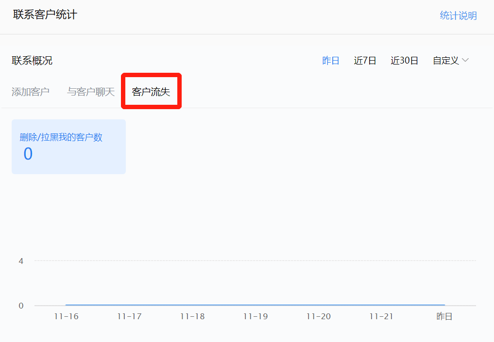 需要注意的是:如果一個客戶在一天內刪除了企業員工,企業員工將其加回好友,該客戶又對該員工進行刪除或者拉黑,那么在客戶流失統計計數的時候,只作一次記錄。