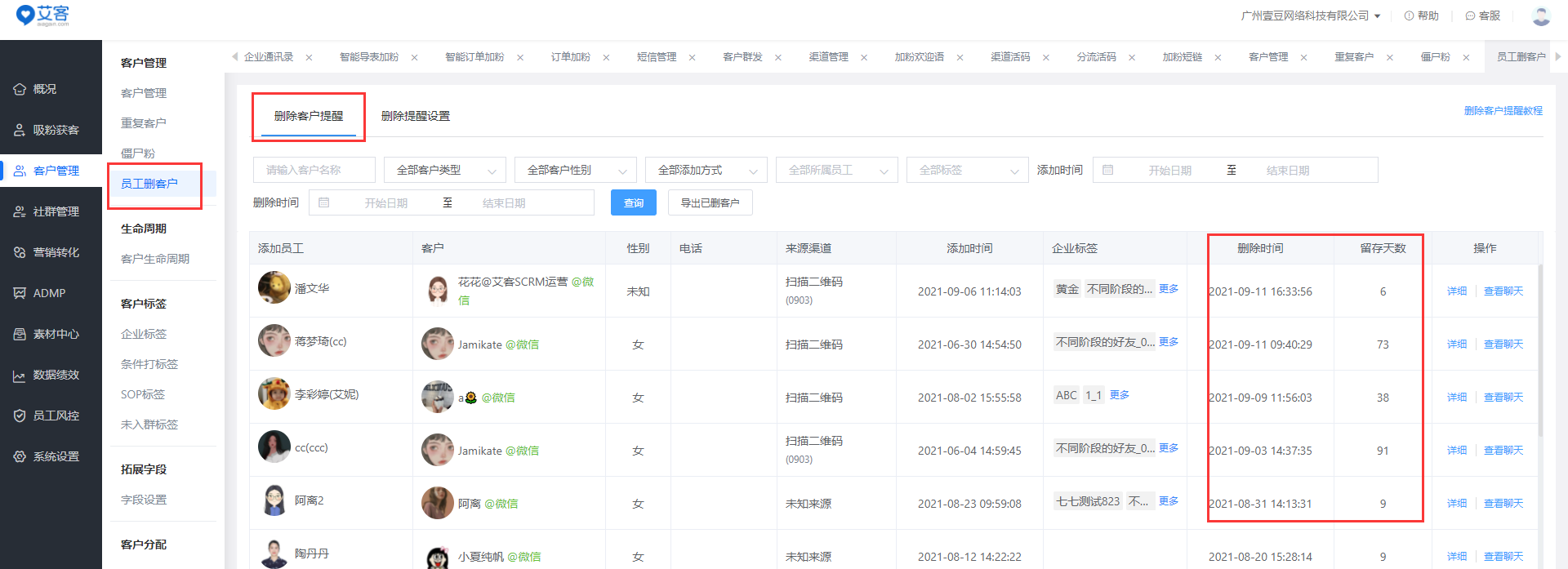 企微是沒有客戶流失提醒功能的。企業想要在客戶流失時收到提醒,可以使用艾客SCRM系統的相關功能:僵尸粉、員工刪除客戶。