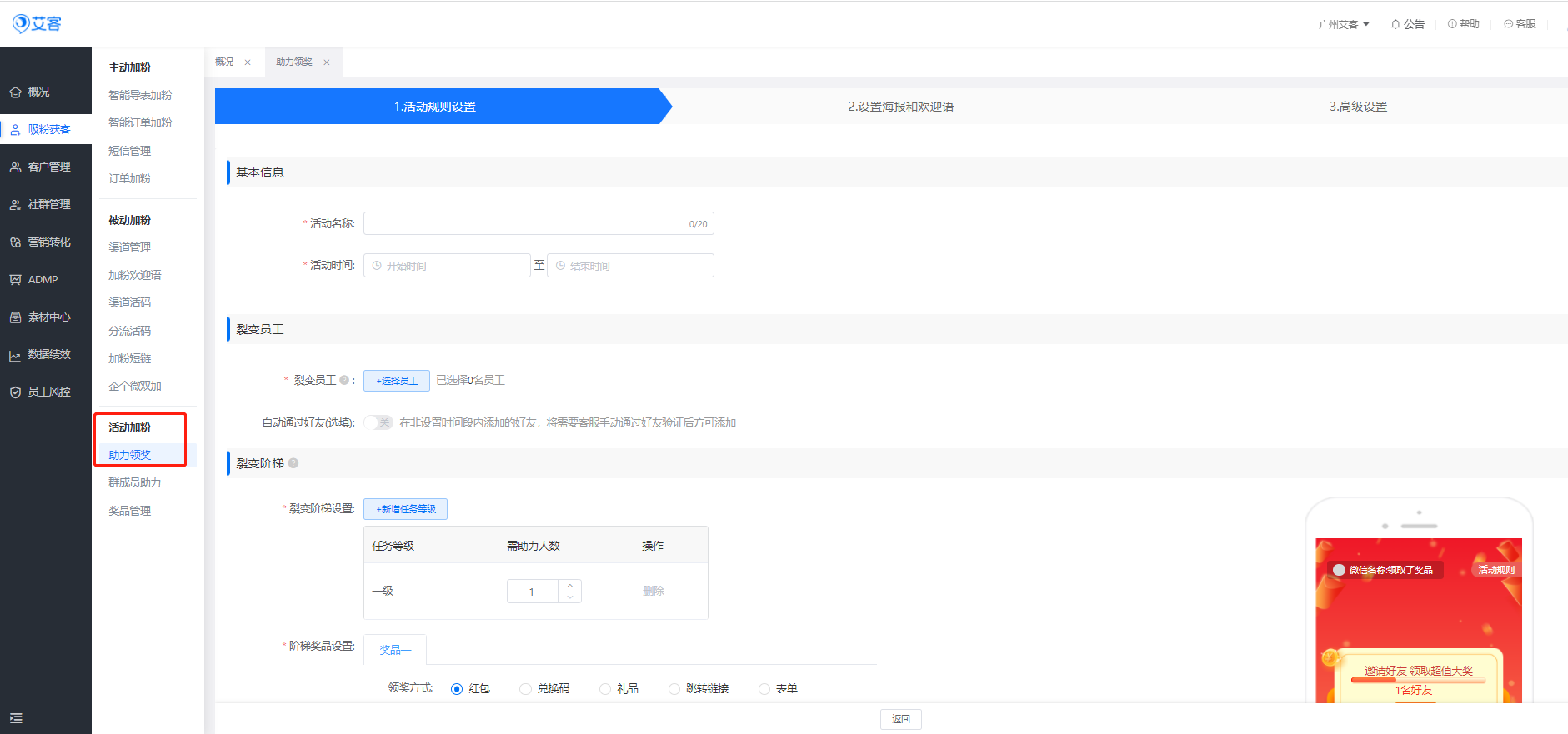 我們可以通過在艾客后臺的【活動加粉】—【助力領獎】中設置活動規則,邀請用戶參與活動,用戶完成任務并領取獎勵,通過以老帶新的方式來提高用戶留存率以及新用戶的裂變增長。