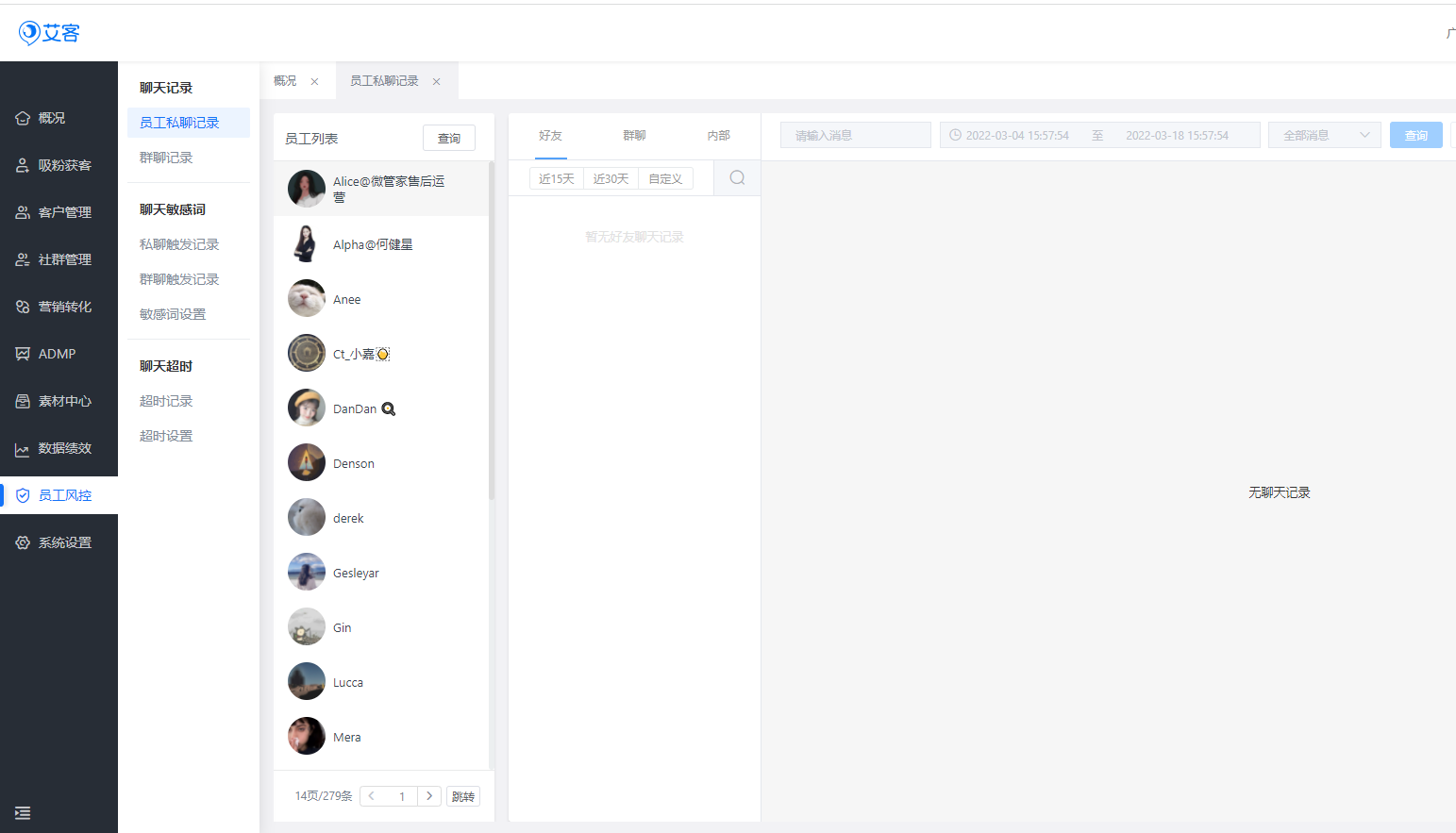 艾客scrm為企業微信授權的服務商,致力于幫助企業精細化高效私域流量運營,開發了眾多的企微輔助功能,例如:員工風控——可以通過設置違規關鍵詞,開啟違規通知等,幫助企業員工高效管理客戶,并且聊天過程中,員工如果有觸發規則,艾客就會立馬發送消息提醒,同時在開通了會話存檔的情況下,還可以查看員工與客戶的聊天記錄,有助于一旦產生客訴,有據可依,保證服務質量。