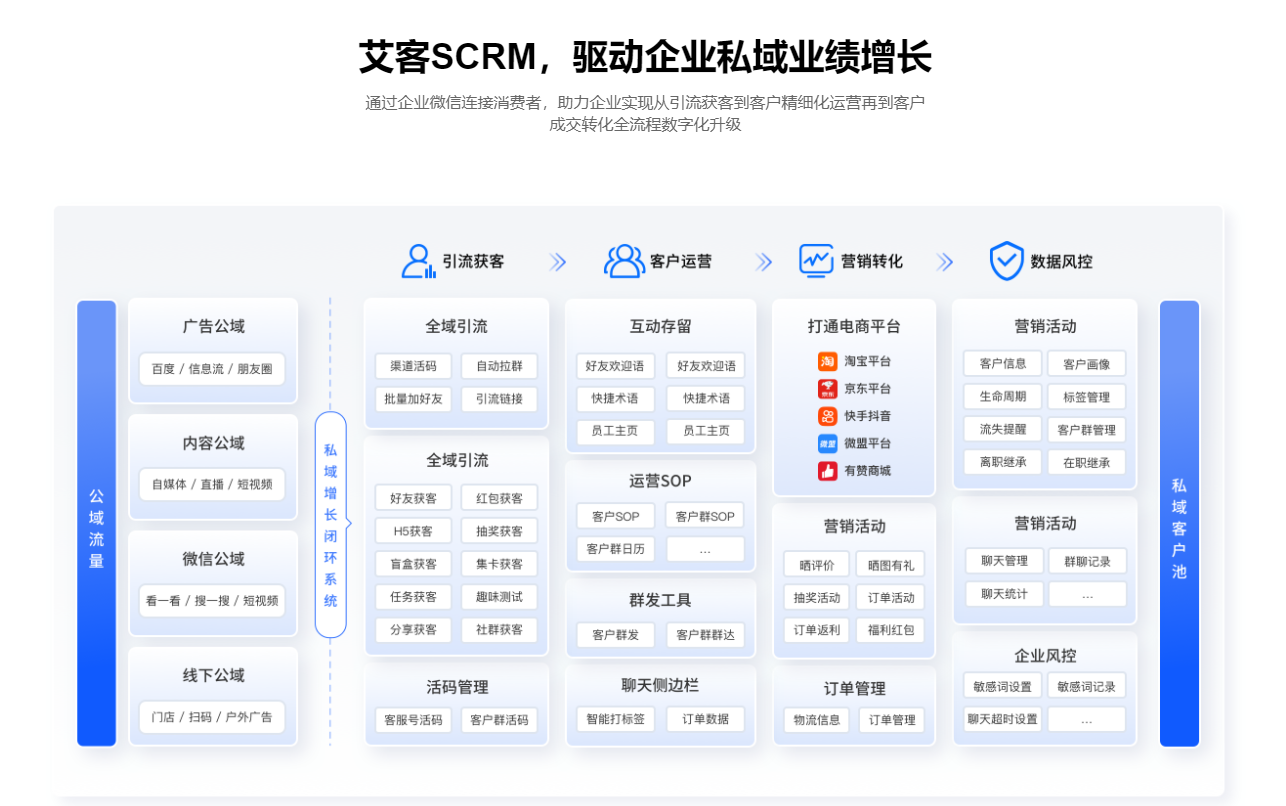 隨著流量紅利的消失,企業(yè)、商家在公域流量獲客成本越來(lái)越高,很多企業(yè)都紛紛開始搭建起自己的私域流量,然而,要做好私域流量運(yùn)營(yíng),也少不了私域流量SCRM管理系統(tǒng),下面跟著艾客來(lái)看看:武漢scrm私域流量管理系統(tǒng)哪個(gè)好?